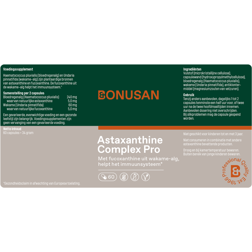 Bonusan Astaxanthine Complex Pro is ontwikkeld op basis van grondig wetenschappelijk onderzoek. Dit supplement bevat twee plantaardige extracten, met astaxanthine en fucoxanthine. Fucoxanthine, uit de wakame-alg, draagt bij tot de normale werking van het immuunsysteem. De formule is zorgvuldig samengesteld door gezondheidsexperts, met uitsluitend essentiële hulpstoffen, zodat je precies krijgt wat je nodig hebt.