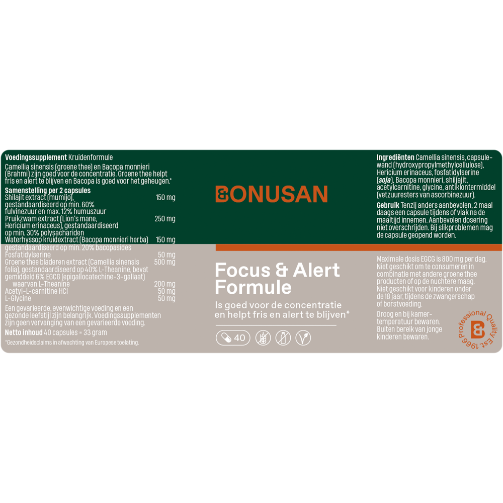 Voor die momenten is er Bonusan Focus & Alert Formule. Een geavanceerde samenstelling van natuurlijke ingrediënten met Bacopa monnieri, Camellia sinensis (groene thee) en shilajit, voor het behoud van een heldere geest en bijdrage aan een normale cognitieve functie*. Zonder de pieken en dalen van dagelijkse oppeppers zoals koffie en energiedrankjes.