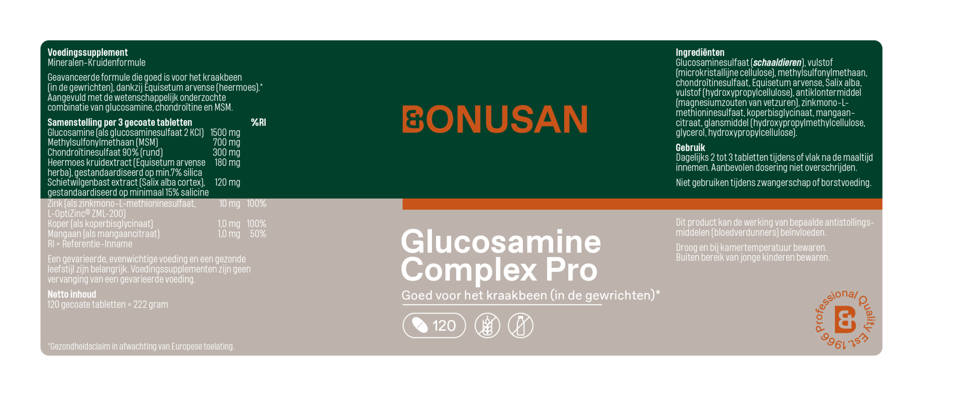 Bonusan Glucosamine Complex Pro is een compleet glucosaminesupplement met de wetenschappelijk onderzochte combinatie van glucosamine, chondroïtrine en MSM. De speciaal samengestelde formule met heermoes is goed voor het kraakbeen (in de gewrichten)*. Het tablet met hoge dosering glucosamine is dankzij heermoes geschikt voor het behoud van soepele gewrichten*.