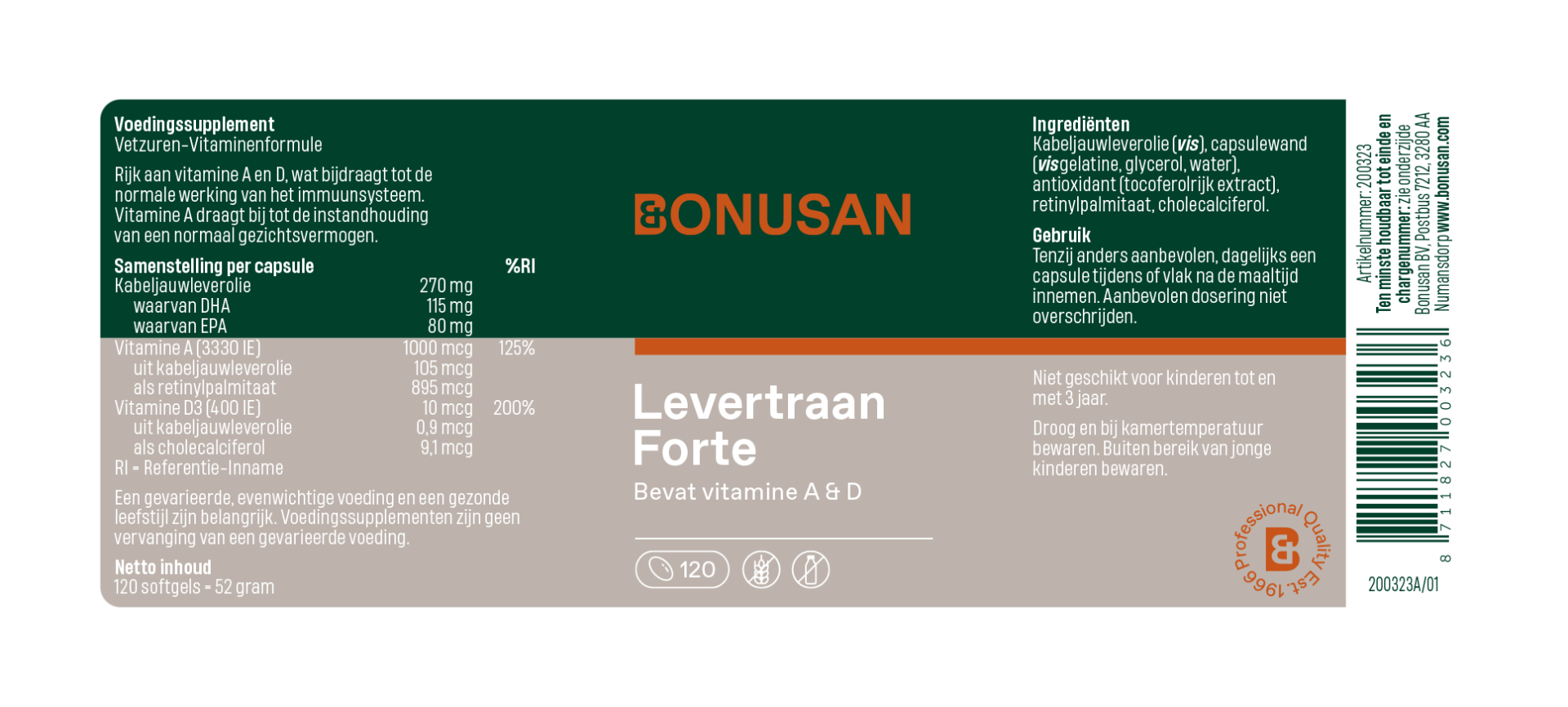 Bonusan Levertraan Forte is een eigentijds levertraansupplement met zowel omega-3 als vitamine A en D3. Nooit meer de gevreesde lepel levertraan die in de jaren '60 populair was, maar een kleine, makkelijk te slikken softgel zonder vissmaak. En je profiteert van dezelfde gunstige effecten als levertraan, want vitamine A en D3 dragen bij tot de normale werking van het immuunsysteem. Bovendien wordt de levertraan gewonnen uit duurzaam gevangen wilde kabeljauw (Friend of the Sea) uit Noorwegen.