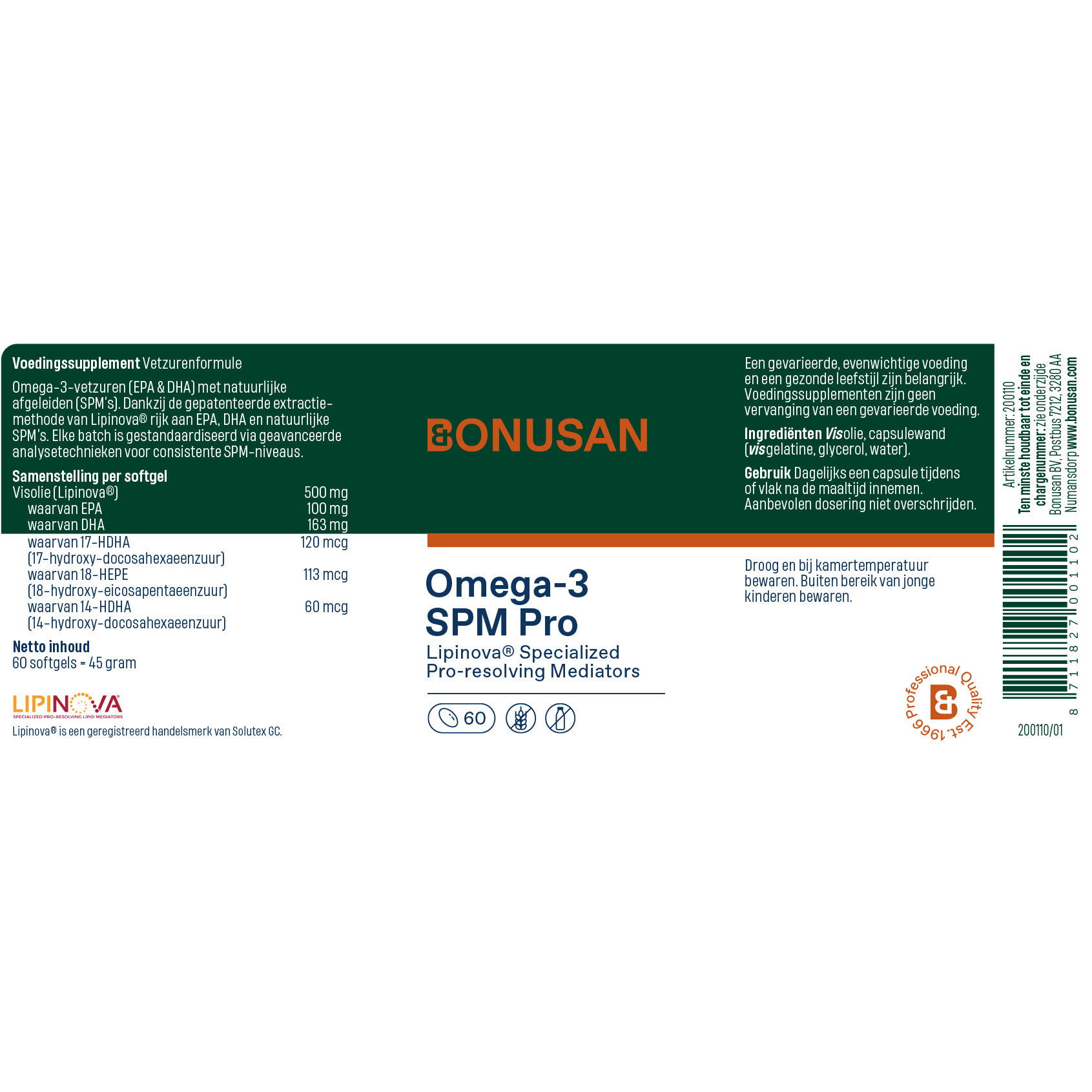 Bonusan Omega-3 SPM Pro biedt een unieke samenstelling van hoogwaardige omega-3 vetzuren met baanbrekende innovaties. Bonusan is het eerste Nederlandse merk dat deze geavanceerde vorm van omega-3 van Lipinova® introduceert. Dankzij de gepatenteerde extractiemethode van Lipinova® is de formule rijk aan EPA, DHA en natuurlijke SPM’s (Specialized Pro-Resolving Mediators). Elke batch is gestandaardiseerd via geavanceerde analysetechnieken voor consistente SPM-niveaus.