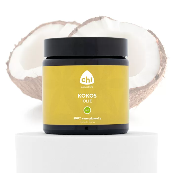 Chi biologische kokosolie is koudgeperst, ongeraffineerd en heeft een heerlijke kokosgeur. De olie wordt geperst uit het verse kopra (vruchtvlees) van de kokosnoot. Al duizenden jaren is kokosolie hét huidverzorgingsproduct in Azië, Zuid-Amerika en Afrika. Nog steeds gebruikt praktisch de helft van de wereldbevolking kokos als dagelijkse huid- en haarverzorging. Een fantastische basis voor onze dagelijkse huidverzorging, zeker wanneer je deze combineert met andere, wat meer vloeibare plantenoliën. Op kamertemperatuur is kokosolie vast maar omdat het smeltpunt tussen de 23 en 27°C ligt smelt de olie zodra je het op de huid aanbrengt.