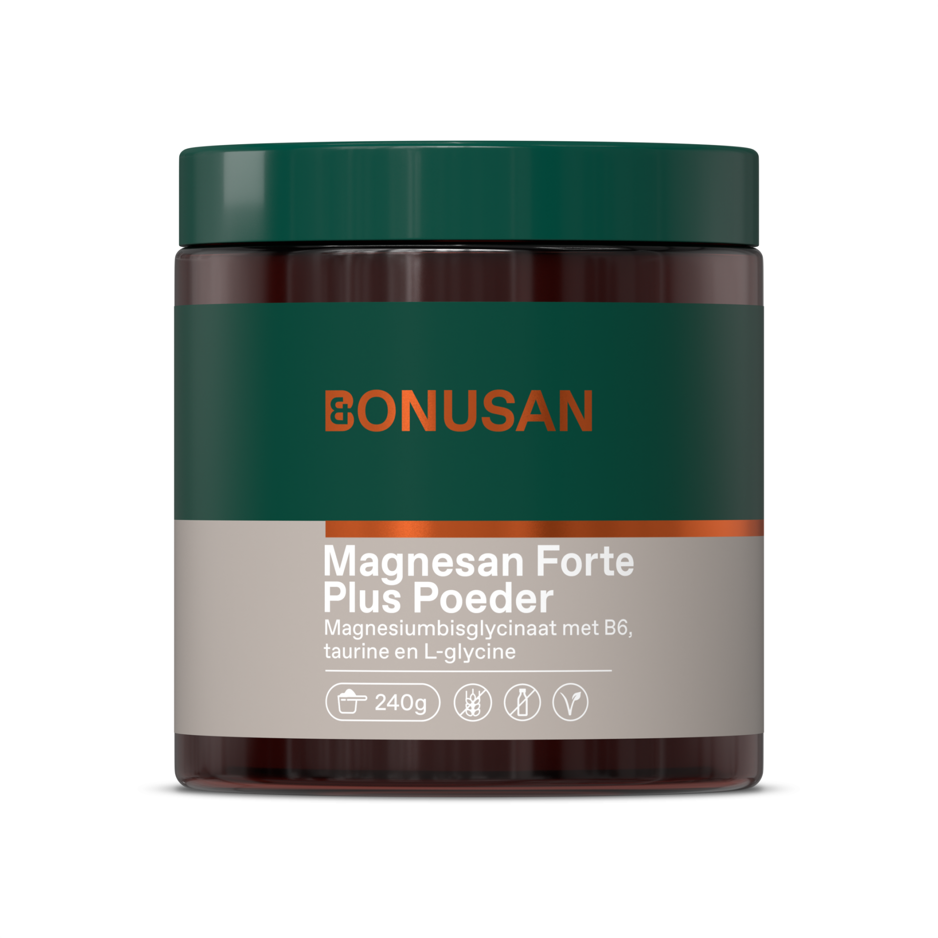 De Magnesan Forte Plus is een van de meest populaire Bonusan producten en bestaat al ruim 20 jaar als uniek magnesium product. Door de jaren heen is de samenstelling geoptimaliseerd aan de hand van de nieuwste wetenschappelijke inzichten. Zo ontwikkelden we recenter Bonusan Magnesan Forte Plus poeder, een poedervariant met maar liefst 114 mg elementair magnesium per maatlepel. Gemakkelijk hoog te doseren: het oplossen van 1 à 2 maatlepels in een glas water of vruchtensap geeft al een flinke aanvulling op de voeding. De Magnesan Forte Plus bevat naast magnesium ook de belangrijke synergisten taurine en L-glycine.
