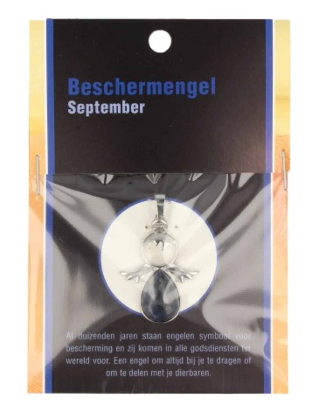 Beschermengel hanger September op kaartje – een zilverkleurig engeltje van 3.5 cm met een lijfje van Dumortieriet. Het engeltje wordt geleverd zonder ketting.