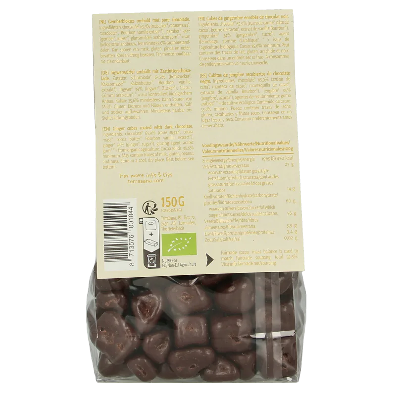 Gekonfijte gemberblokjes omhuld met pure chocolade - 150 g