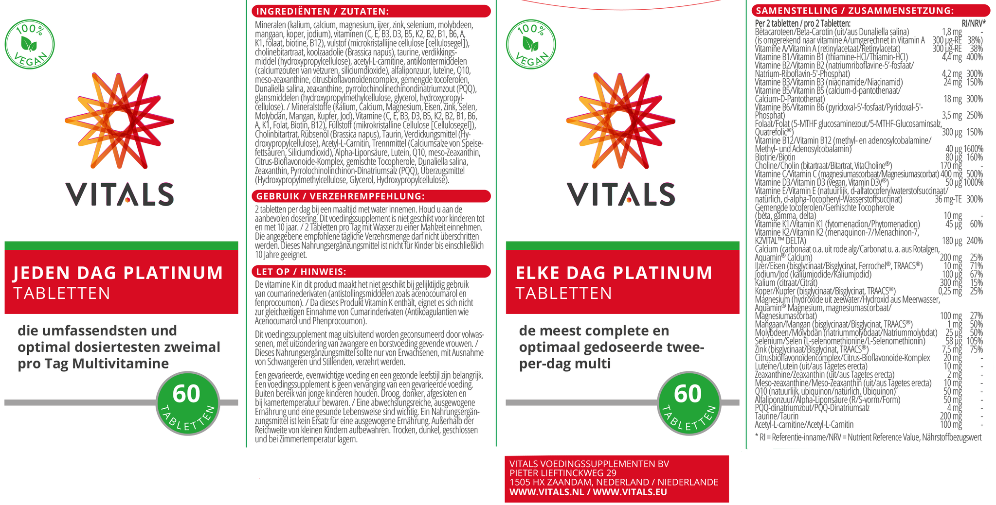 Mineralen (kalium, calcium, magnesium, ijzer, zink, selenium, molybdeen, mangaan, koper, jodium), vitaminen (C, E, B3, D3, B5, K2, B2, B1, B6, A, K1, folaat, biotine, B12), vulstof (microkristallijne cellulose [cellulosegel]), cholinebitartraat, koolzaadolie (Brassica napus), taurine, verdikkingsmiddel (hydroxypropylcellulose), acetyl-L-carnitine, antiklontermiddelen (calciumzouten van vetzuren, siliciumdioxide), alfaliponzuur, luteïne, Q10, meso-zeaxanthine, citrusbioflavonoïdencomplex, gemengde tocoferolen, Dunaliella salina, zeaxanthine, pyrrolochinolinechinondinatriumzout (PQQ), glansmiddelen (hydroxypropylmethylcellulose, glycerol, hydroxypropylcellulose).