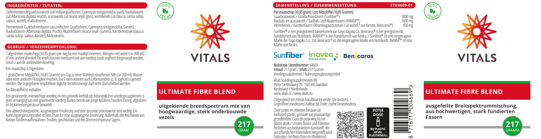 Gefermenteerde guarboonvezels (uit Indiase guarbonen, Cyamopsis tetragonoloba, zaad), baobabvezels (uit Adansonia digitata, vrucht), acaciavezels (uit Acacia seyal, gom), wortelvezels (uit Daucus carota subsp. sativus, wortel), maltodextrine.